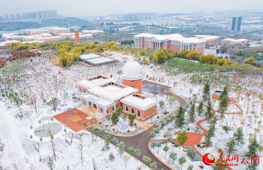 The campus of Yunnan University in Kunming city, capital of southwest China’s Yunnan Province, is beautifully decorated with snow during a cold spell in late spring, Feb. 22, 2022. (Photo/Wang Wei)