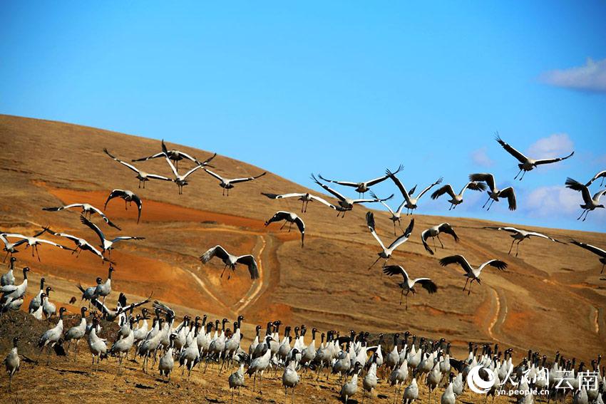 Migratory black-necked cranes in the Yunnan Dashanbao National Nature Reserve for Black-necked Cranes in Zhaotong city, southwest China’s Yunnan Province, begin their journey back to northern China, March 2022. (Photo/Wu Taiping)
