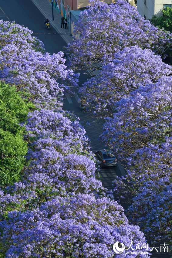 Photo shows gorgeous blue jacaranda blossoms on both sides of a road in Kunming city, capital of southwest China’s Yunnan Province, May 2022. (Photo/Yang Wu)