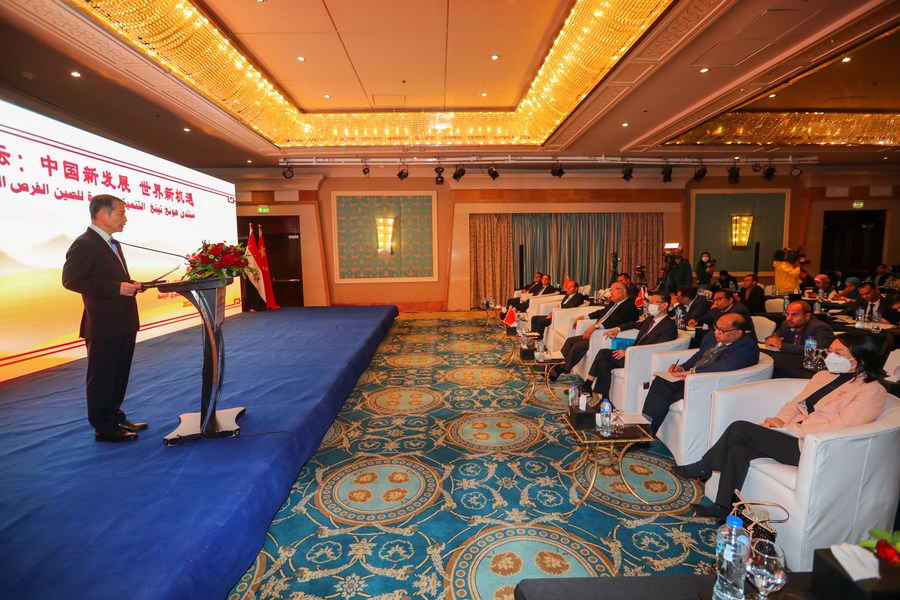 Chinese Ambassador to Egypt Liao Liqiang addresses a symposium on Sino-Arab relations and ways to enhance them in the future, in Cairo, Egypt, Dec. 28, 2022. (Xinhua/Sui Xiankai)