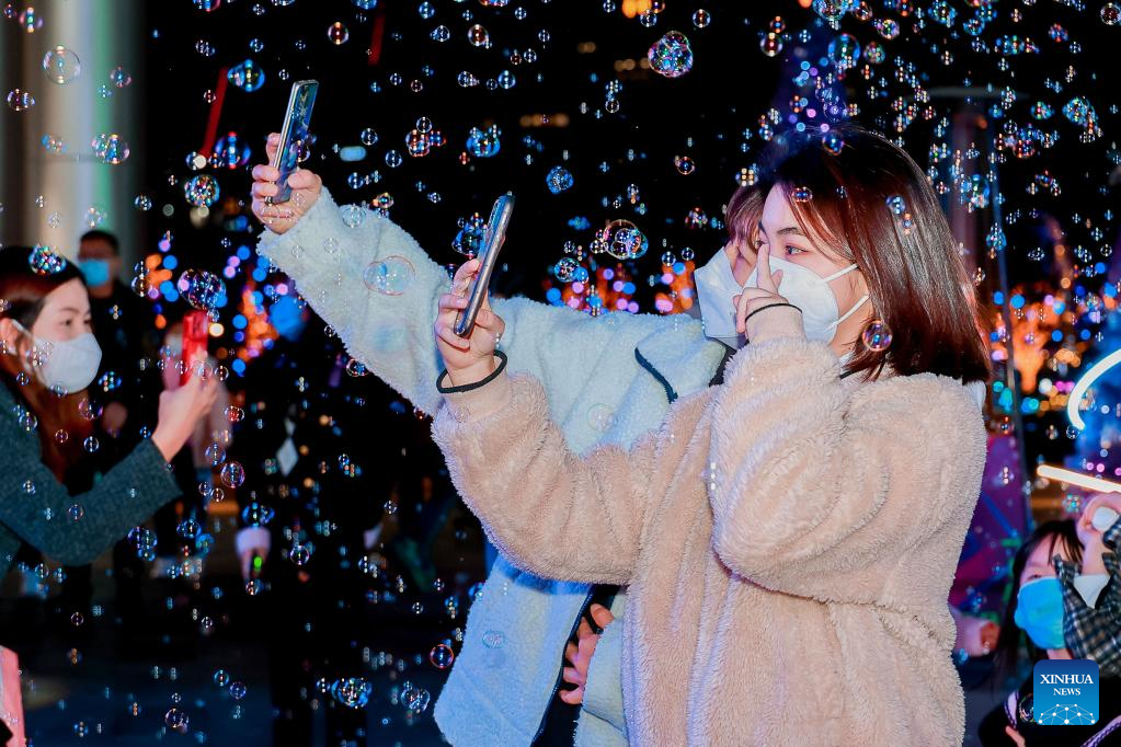 Tourists take selfies at Tiande Square in Guangzhou, south China's Guangdong Province, Jan. 1, 2023. People take part in various leisure activities to spend the New Year holiday here. (Xinhua/Liu Dawei)