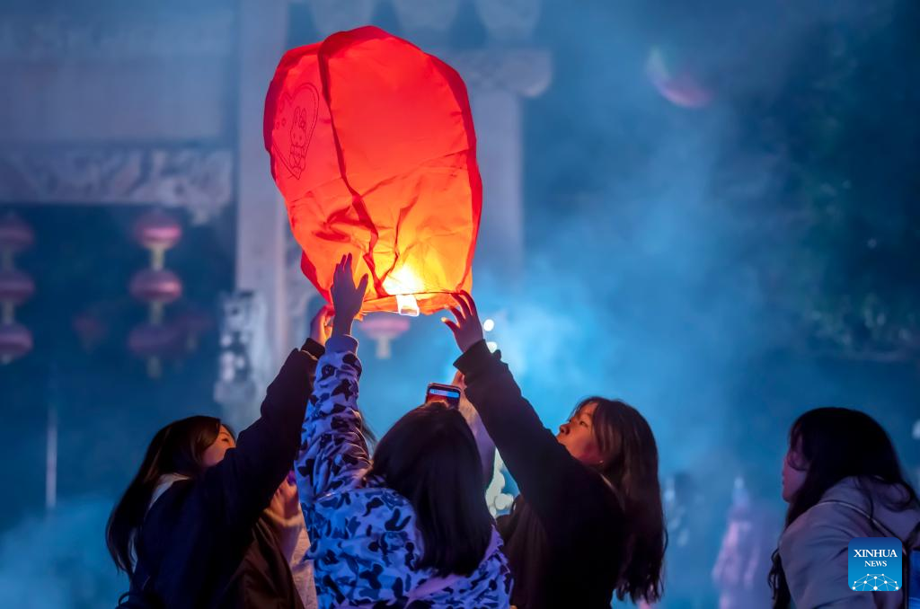 People release a sky lantern to make a wish for good fortune at a park in Qianxi, southwest China's Guizhou Province, Jan. 1, 2023. (Photo by Fan Hui/Xinhua)