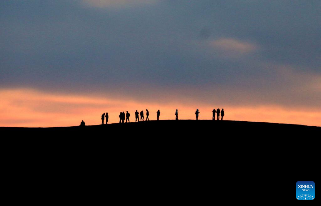 Tourists visit Mingsha Mountain and Crescent Spring scenic spot in Dunhuang City, northwest China's Gansu Province, Jan. 1, 2023. (Photo by Zhang Xiaoliang/Xinhua)