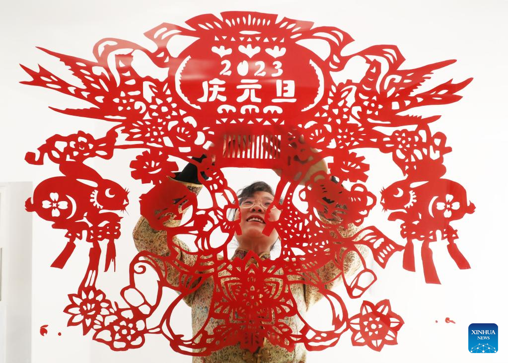 A woman makes paper cutting works in Fengrun District of Tangshan, north China's Hebei Province, Jan. 1, 2023. (Photo by Zhu Dayong/Xinhua)