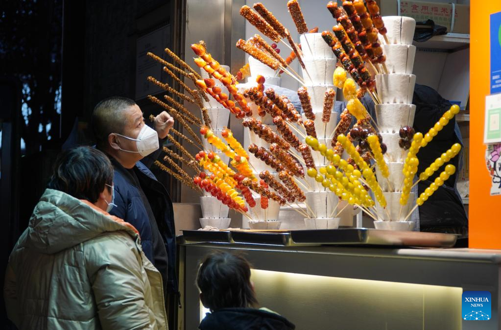 People buy sugar-coated haws on Furong Street in Jinan, east China's Shandong Province, Jan. 2, 2023. (Xinhua/Xu Suhui)