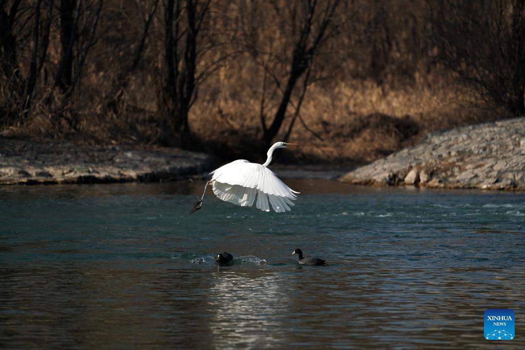 An egret forages at Fenhe River in Taiyuan, capital city of north China's Shanxi Province, Jan. 4, 2023. (Xinhua/Zhan Yan)