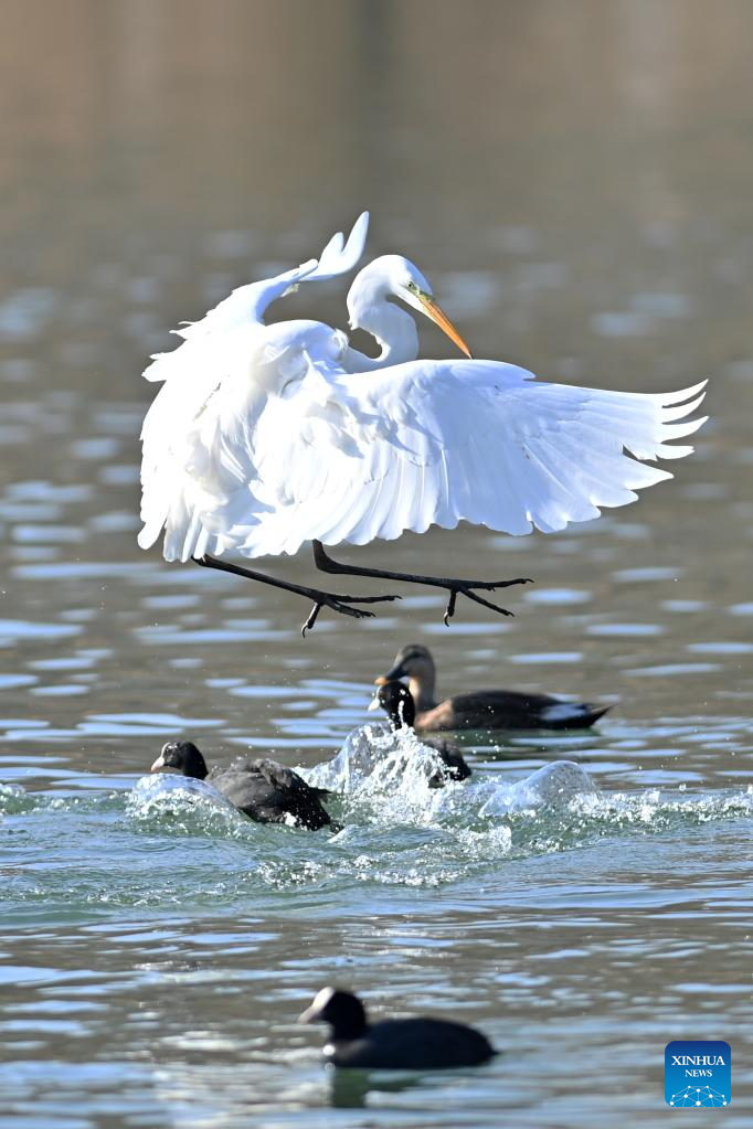 Egrets forage at Fenhe River in Taiyuan, capital city of north China's Shanxi Province, Jan. 4, 2023. (Xinhua/Yang Chenguang)