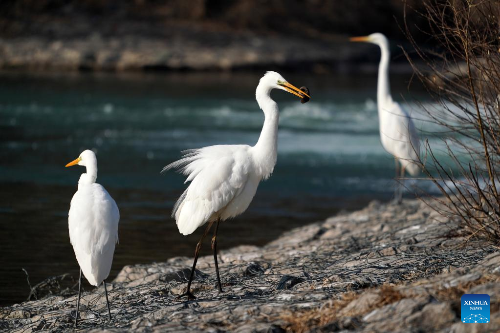 Egrets rest along Fenhe River in Taiyuan, capital city of north China's Shanxi Province, Jan. 4, 2023. (Xinhua/Zhan Yan)