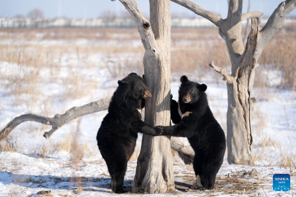 Black bears are pictured in a bear park in Fuyuan City, northeast China's Heilongjiang Province, Jan. 10, 2023. (Xinhua/Wang Jianwei)