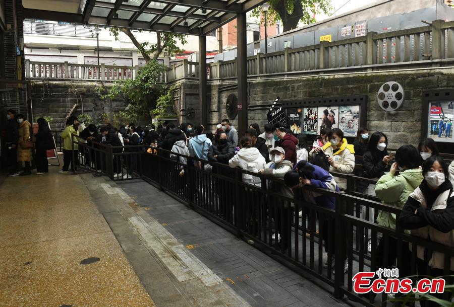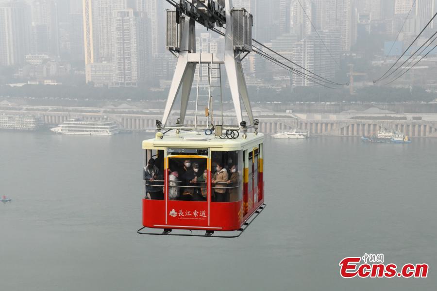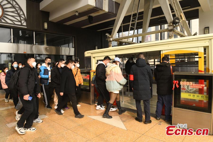 Tourists queue to take a cable car crossing the Yangtze River in Chongqing, Jan. 10, 2023. (Photo: China News Service/Zhou Yi)