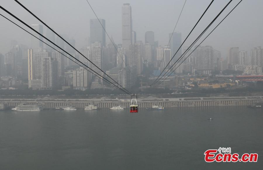 A cable car runs across the Yangtze River in Chongqing, providing tourists with breathtaking views of the mountain city, Jan. 10, 2023. (Photo: China News Service/Zhou Yi)