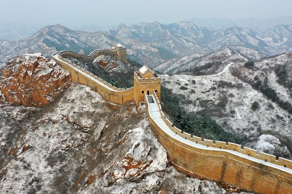 This aerial photo taken on Jan. 13, 2023 shows the snow scenery of Jinshanling Great Wall in Luanping County of north China's Hebei Province. (Photo by Zhou Wanping/Xinhua)