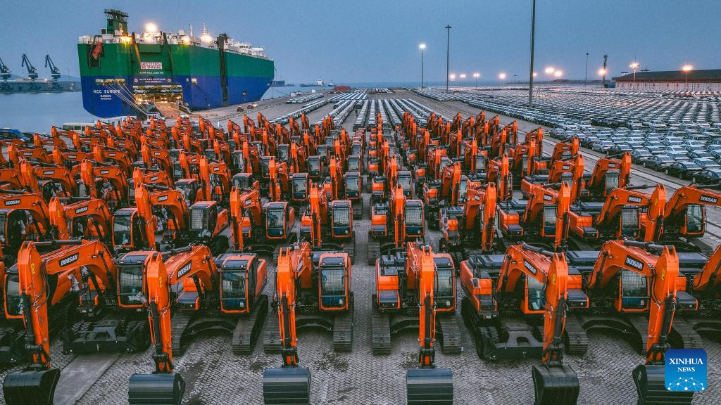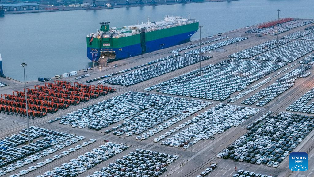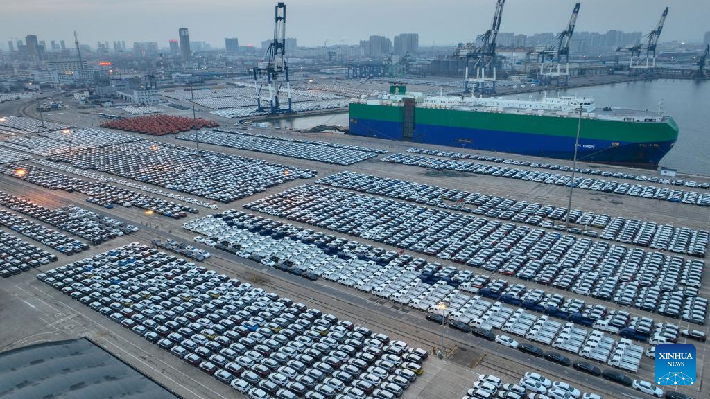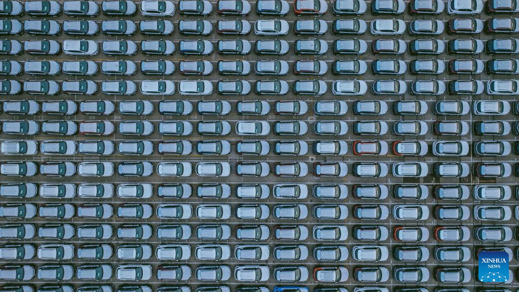 This aerial photo taken on Jan. 18, 2023 shows vehicles waiting for shipment at Yantai Port in Yantai, east China's Shandong Province. The port is seeing busy days ahead of the upcoming Spring Festival as arrays of vehicles waiting for shipment occupy its roll-on/roll-off terminal. (Xinhua/Zhu Zheng)