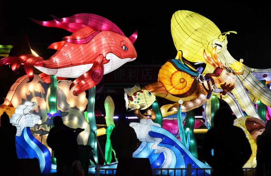 People tour an ocean-themed lantern show in Qingdao, east China's Shandong Province, Jan. 24, 2023. (Xinhua/Li Ziheng)