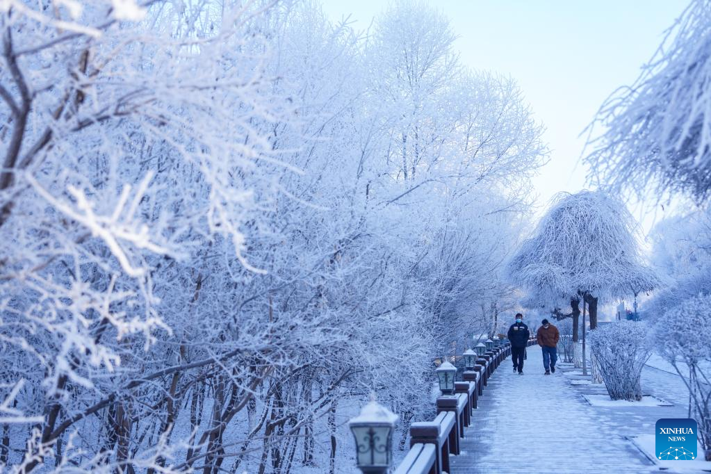 People enjoy the rime scenery near the Songhua River in Jilin City, northeast China's Jilin Province, Jan. 30, 2023. (Xinhua/Yan Linyun)
