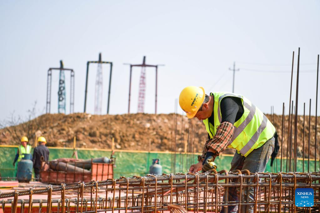 A man works at the construction site of an aerospace industry incubator project in Gui'an New Area, southwest China's Guizhou Province, Feb. 1, 2023. The construction of 687 major projects, with a total investment of more than 376.7 billion yuan (about 55.9 billion U.S. dollars), commenced in Guizhou Province on Wednesday. (Xinhua/Yang Wenbin)