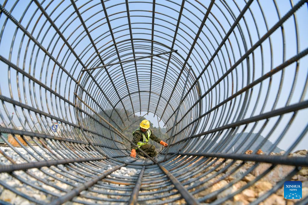 A man works at the construction site of a Midea Group's project in Gui'an New Area, southwest China's Guizhou Province, Feb. 1, 2023. The construction of 687 major projects, with a total investment of more than 376.7 billion yuan (about 55.9 billion U.S. dollars), commenced in Guizhou Province on Wednesday. (Xinhua/Yang Wenbin)