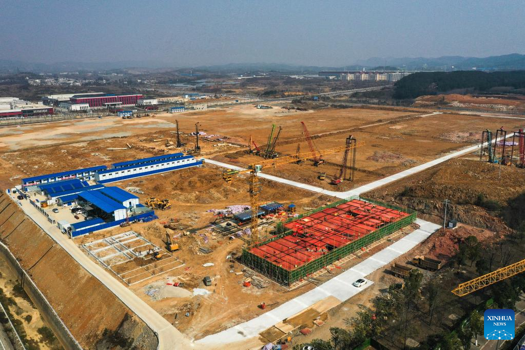 This aerial photo taken on Feb. 1, 2023 shows the construction site of an aerospace industry incubator project in Gui'an New Area, southwest China's Guizhou Province. The construction of 687 major projects, with a total investment of more than 376.7 billion yuan (about 55.9 billion U.S. dollars), commenced in Guizhou Province on Wednesday. (Xinhua/Yang Wenbin)