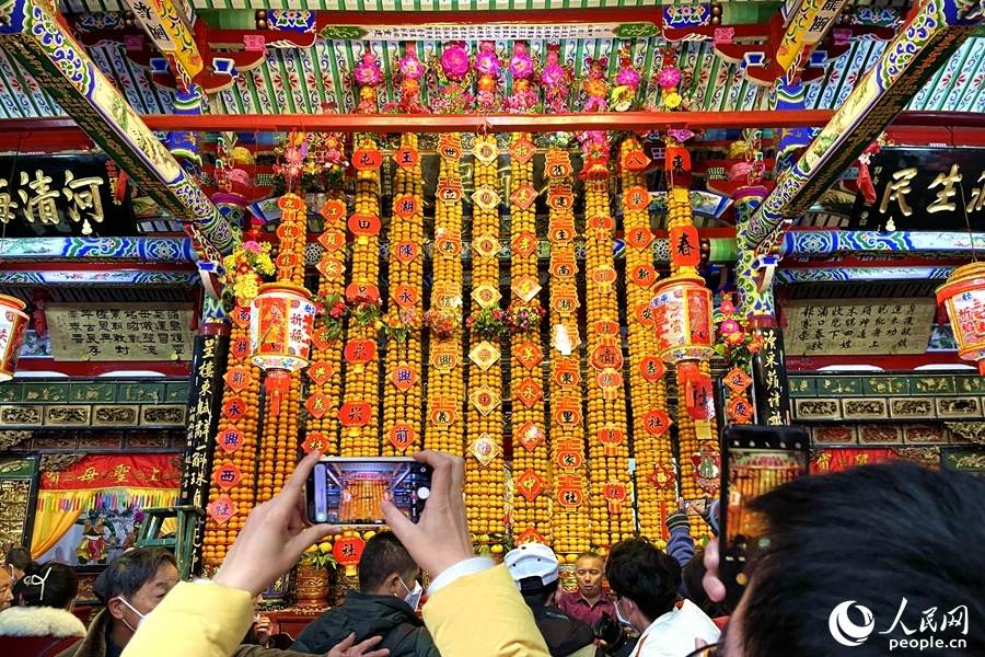 On Jan. 24, 2023, the third day of the first lunar month, Jiangdong villagers were busy piling up oranges in Pukou Palace, a local custom in which they pray for blessings, safety and good fortune in the New Year. The orange pagoda originates from the fruit shrine that was built as a tribute to Imperial Consort Mei of the Tang Dynasty (618-907), whose hometown was Jiangdong village.