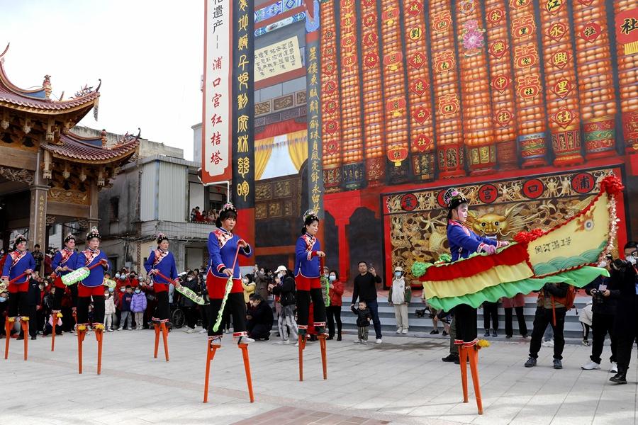 Folklore actresses perform stilt-walking in Jiangdong village in Putian city, southeast China’s Fujian Province. (People’s Daily Online/Yao Wenfeng)