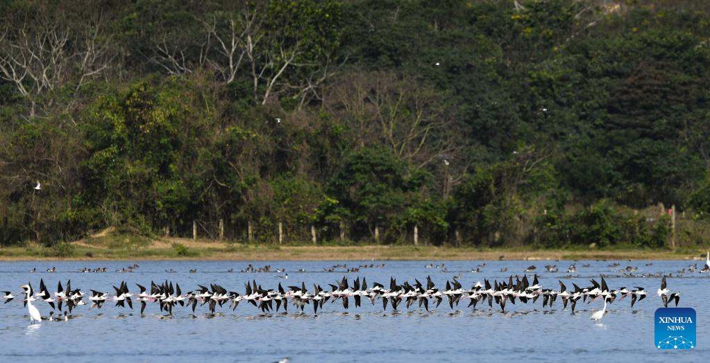 A flock of black-winged stilts are observed in Dongzhaigang National Nature Reserve in south China's Hainan Province, Jan. 30, 2023. February 2 marks World Wetlands Day. A total of 32,036 water birds of 71 species were observed during a latest annual survey of water birds wintering in Hainan. Among them, 201 black-faced spoonbills were recorded, the highest number since the survey of wintering water birds began in 2003. (Xinhua/Yang Guanyu)