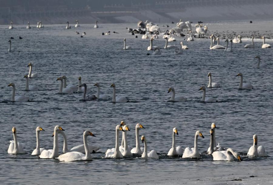 Swans play and rest on the Peacock River in Korla city, northwest China's Xinjiang Uygur autonomous region, Feb 2, 2023. (Photo: China News Service/ Que Hure)
