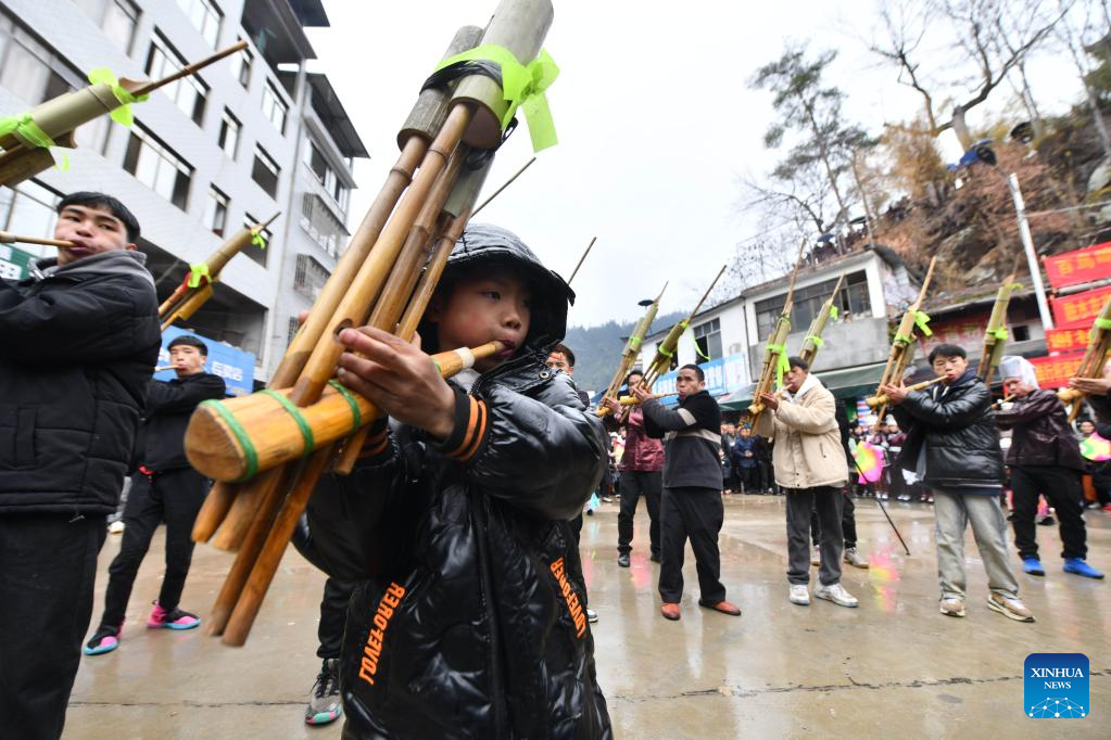 People of various ethnic groups blow Lusheng, a traditional reed-pipe wind instrument, during the "Bainiaoyi" Lusheng festival in Gandong Township, Rongshui Miao Autonomous County, south China's Guangxi Zhuang Autonomous Region, Feb. 2, 2023. "Bainiaoyi" Lusheng festival is a traditional festival in Gandong Township, which is held on the 12th day of the first month on Chinese lunar calendar, during which people wear "bainiaoyi," a traditional clothing of ethnic group, blow Lusheng and perform traditional dancing. (Xinhua/Huang Xiaobang)