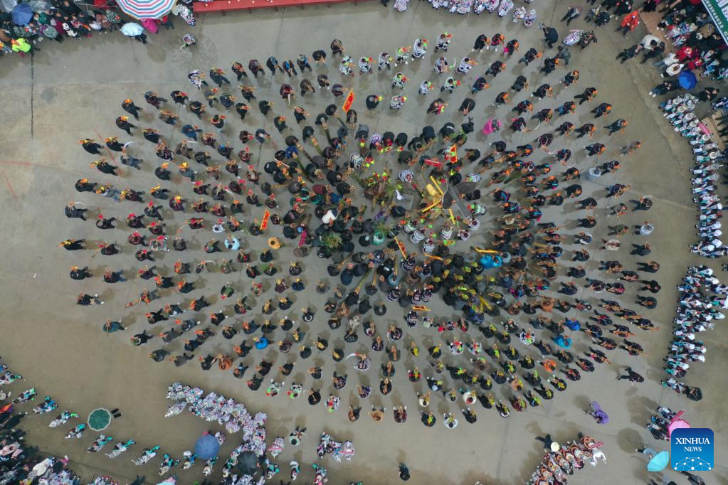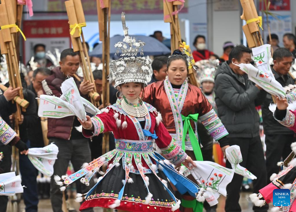 People of Miao ethnic group take part in the "Bainiaoyi" Lusheng festival in Dangjiu Village, Gandong Township, Rongshui Miao Autonomous County, south China's Guangxi Zhuang Autonomous Region, Feb. 2, 2023. "Bainiaoyi" Lusheng festival is a traditional festival in Gandong Township, which is held on the 12th day of the first month on Chinese lunar calendar, during which people wear "bainiaoyi," a traditional clothing of ethnic group, blow Lusheng, a traditional reed-pipe wind instrument, and perform traditional dancing. (Xinhua/Huang Xiaobang)