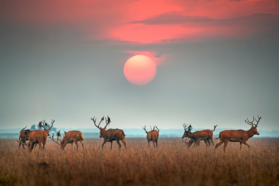 Photo shows a herd of elks against the setting sun at a rare bird national nature reserve in Yancheng, east China’s Jiangsu Province. (Photo/Ben Daochun)