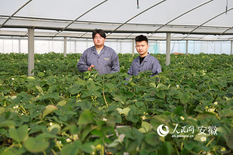 Zhu Jiaojie (left) and Li Lingfeng in Guangde city, east China’s Anhui Province, where they have taken up strawberry planting. (People’s Daily Online/Zhang Jun)