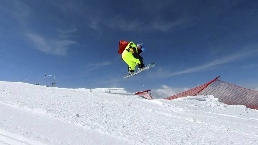 Nie Rongchen, a young boy, enjoys snowboarding in the ski resort of Koktokay, northwest China's Xinjiang Uygur Autonomous Region, April 27, 2022. (Xinhua)