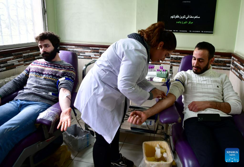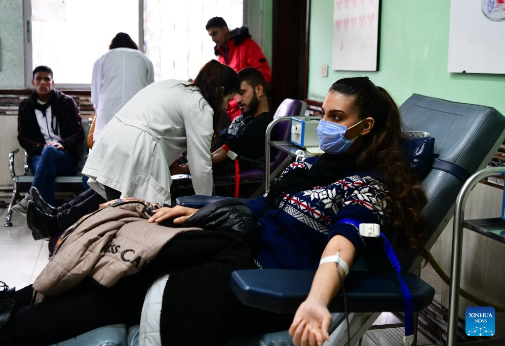 People donate blood at a blood donation center in Damascus, capital of Syria, Feb. 8, 2023. The death toll from Monday's devastating earthquakes in Trkiye and Syria has surpassed 17,000, according to latest data. In Syria, at least 1,581 were killed in government-held areas, and the death toll in the opposition-held region is 1,975, according to media reports. (Photo by Ammar Safarjalani/Xinhua)