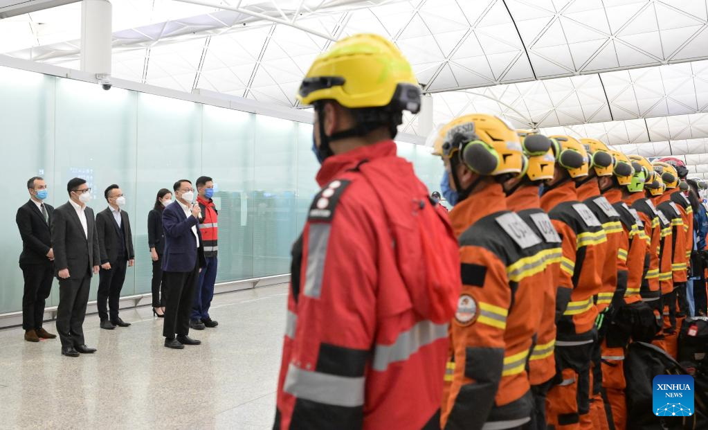 Chan Kwok-ki (5th L), acting chief executive of the Hong Kong Special Administrative Region (HKSAR), addresses members of a rescue team at the Hong Kong International Airport in Hong Kong, south China, Feb. 8, 2023. China's Hong Kong Special Administrative Region (HKSAR) government said on Wednesday that it has sent a search and rescue team of 59 members to earthquake-hit Trkiye. (Xinhua)