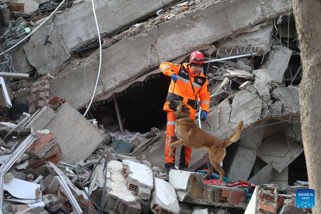 Rescuers carry out rescue operation with rescue dogs in Adiyaman, Trkiye, Feb. 8, 2023. The death toll from Monday's devastating earthquakes in Trkiye and Syria has surpassed 17,000, according to latest data. (Photo by Mustafa Kaya/Xinhua)