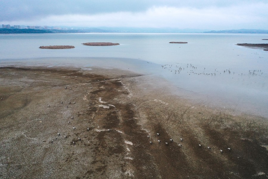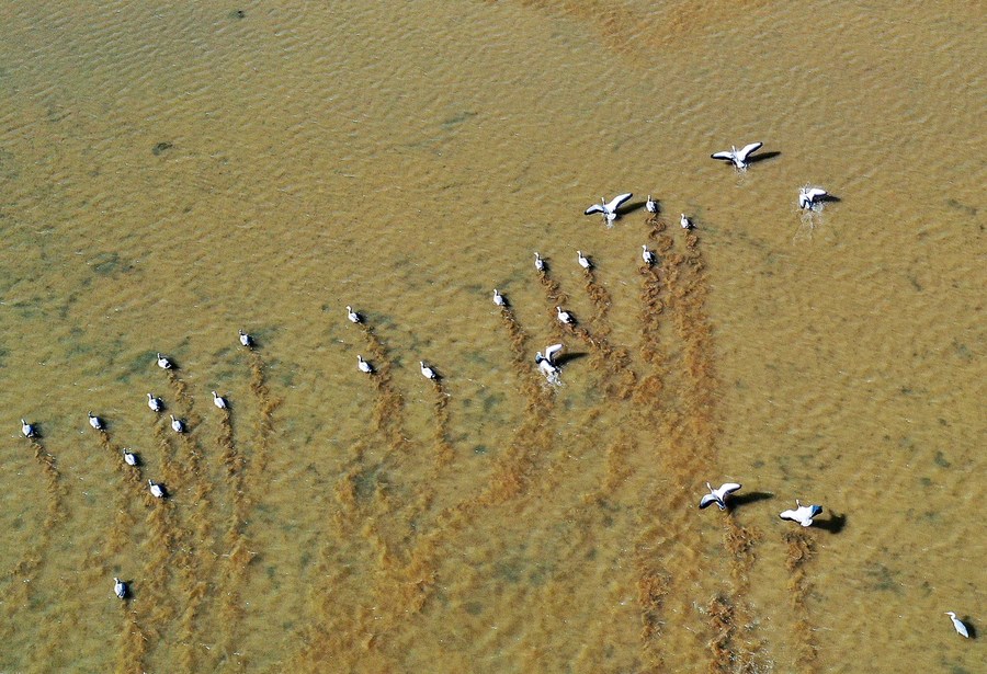 This aerial photo shows migrant birds foraging at the Caohai National Nature Reserve in the Yi, Hui and Miao Autonomous County of Weining, southwest China's Guizhou Province, Feb. 9, 2023. (Xinhua/Yang Wenbin)