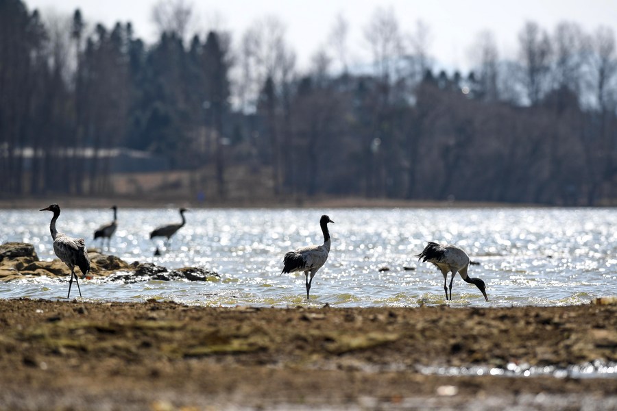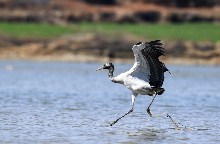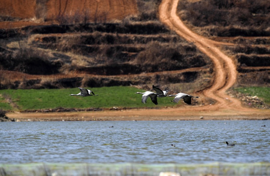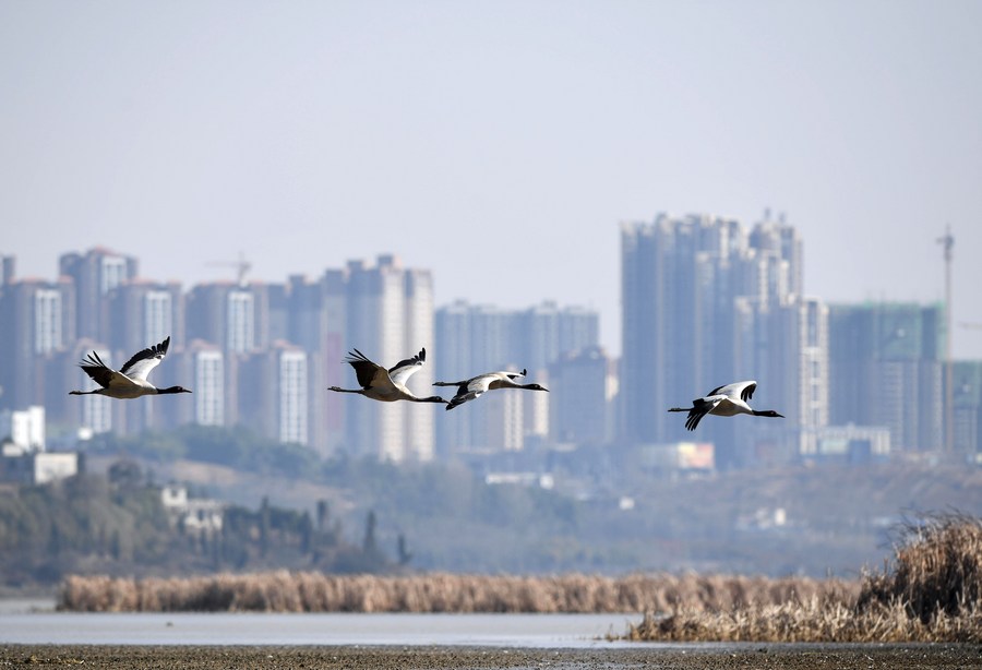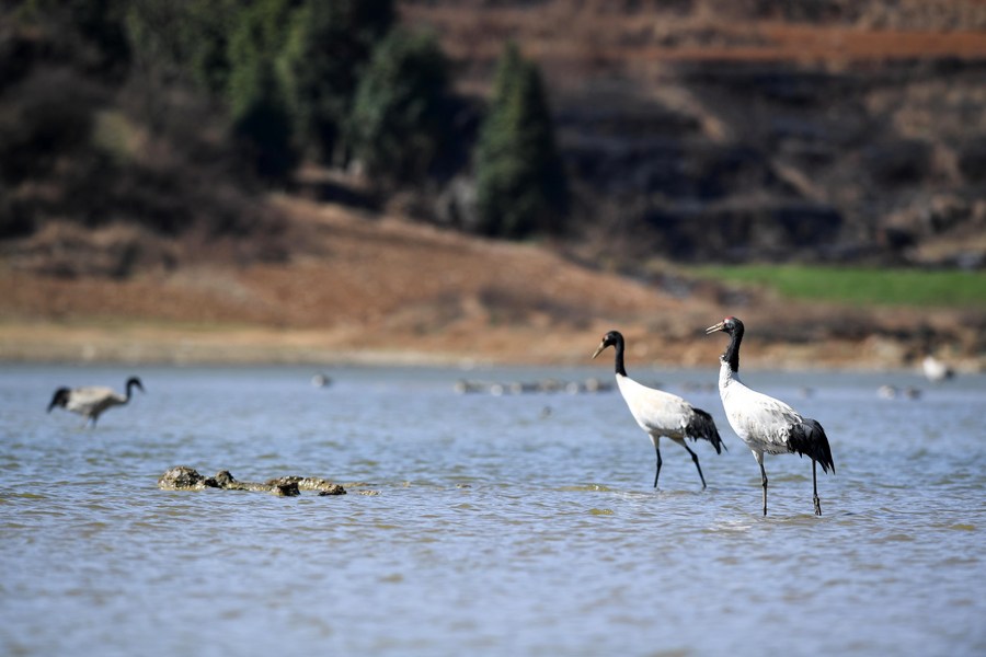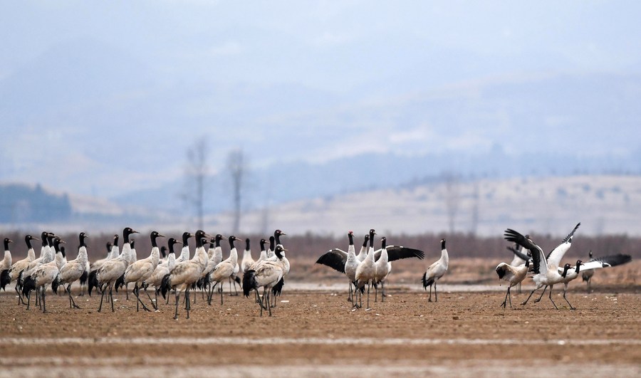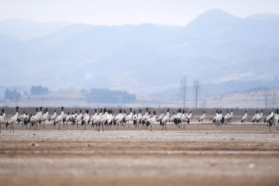 WEINING, Feb. 11 (Xinhua) -- Over the years, the populations and types of wintering rare bird species in the Caohai reserve have increased. The reserve is now home to over 100,000 wintering migratory birds, including grey cranes, bar-headed geese, and black-necked cranes, among other species. The number of wintering black-necked cranes has reached 2,588.