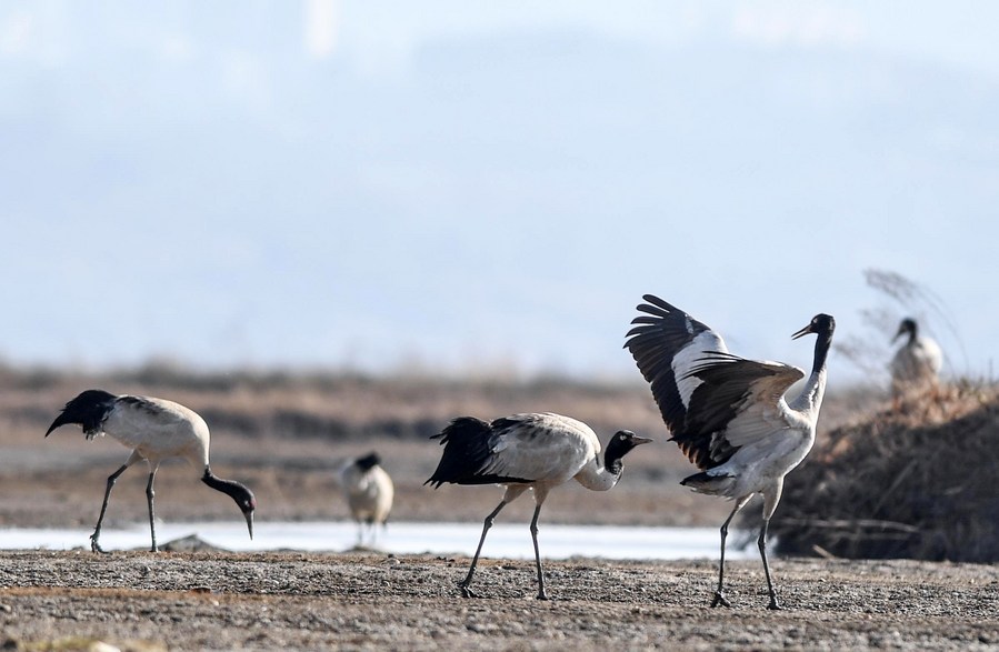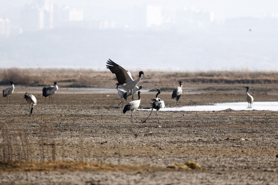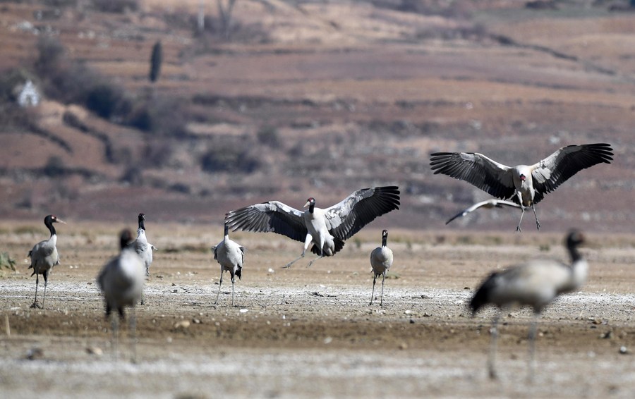 Black-necked cranes are pictured at the Caohai National Nature Reserve in the Yi, Hui and Miao Autonomous County of Weining, southwest China's Guizhou Province, Feb. 9, 2023. (Xinhua/Yang Wenbin)
