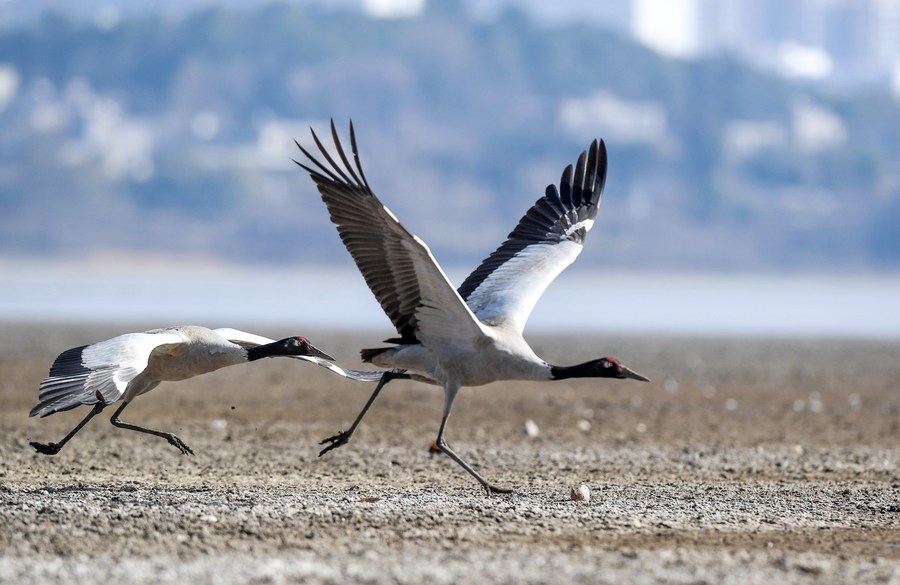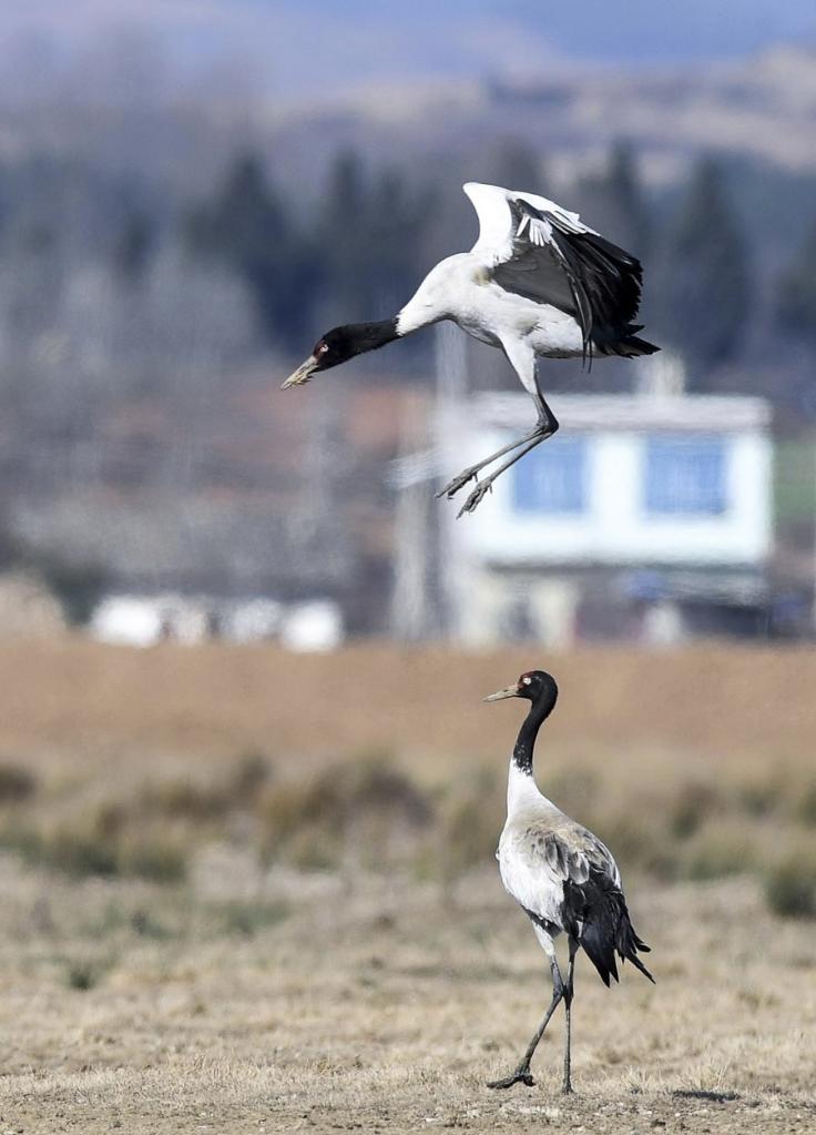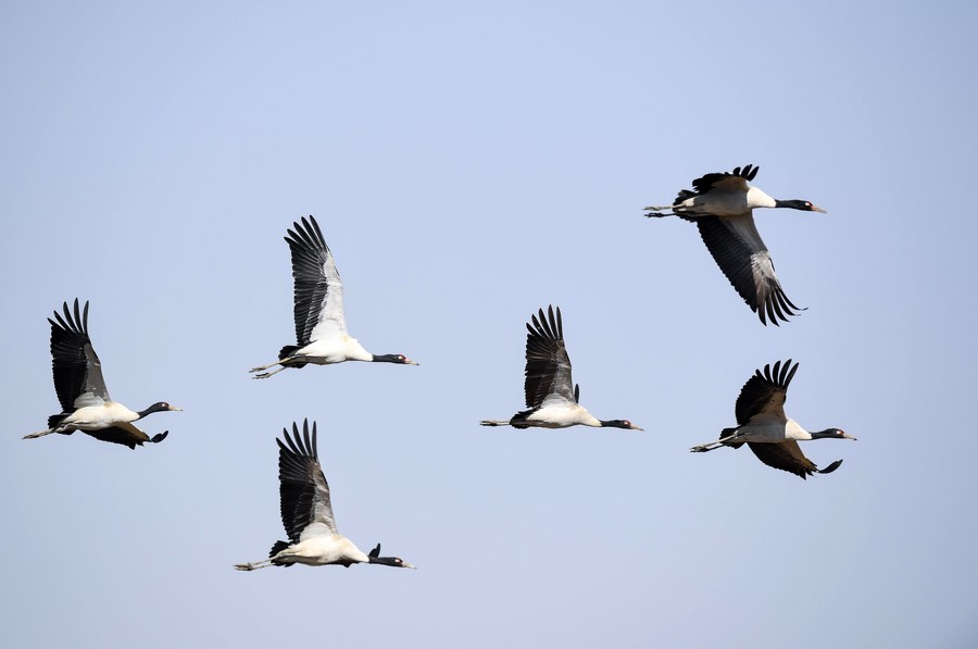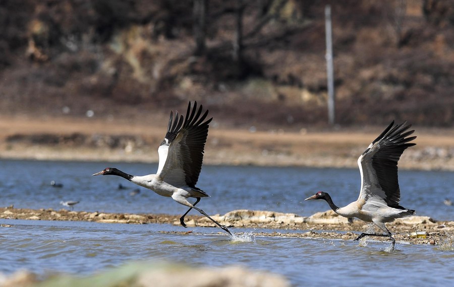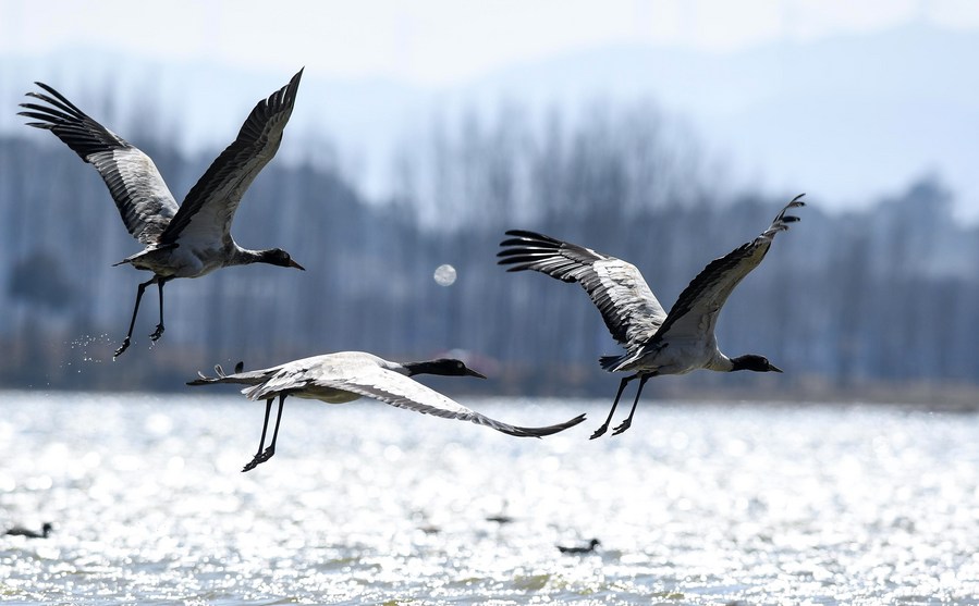 Black-necked cranes fly at the Caohai National Nature Reserve in the Yi, Hui and Miao Autonomous County of Weining, southwest China's Guizhou Province, Feb. 10, 2023. (Xinhua/Yang Wenbin)