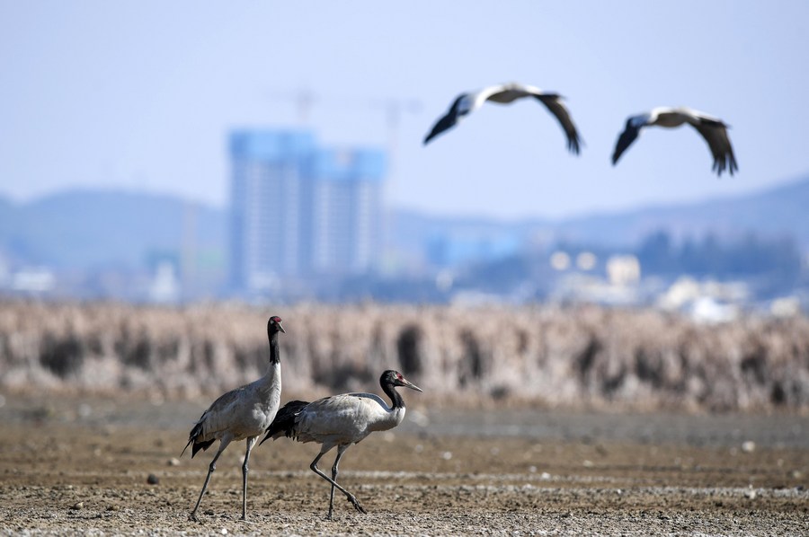 Black-necked cranes are pictured at the Caohai National Nature Reserve in the Yi, Hui and Miao Autonomous County of Weining, southwest China's Guizhou Province, Feb. 10, 2023. (Xinhua/Yang Wenbin)
