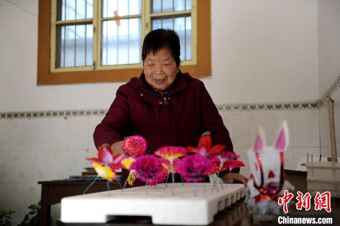 Wang Pufang arranges paper flowers she made. (Chinanews.com/Gao Cheng)