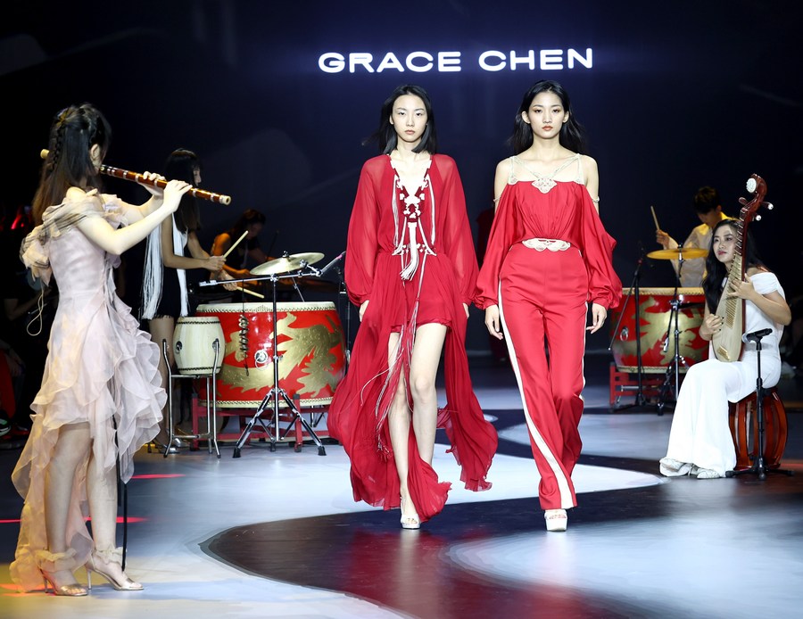 Models present the creations of a designer during a fashion week at the second China International Consumer Products Expo (CICPE) in Haikou, south China's Hainan Province, on July 26, 2022. (Xinhua/Chen Jianli)