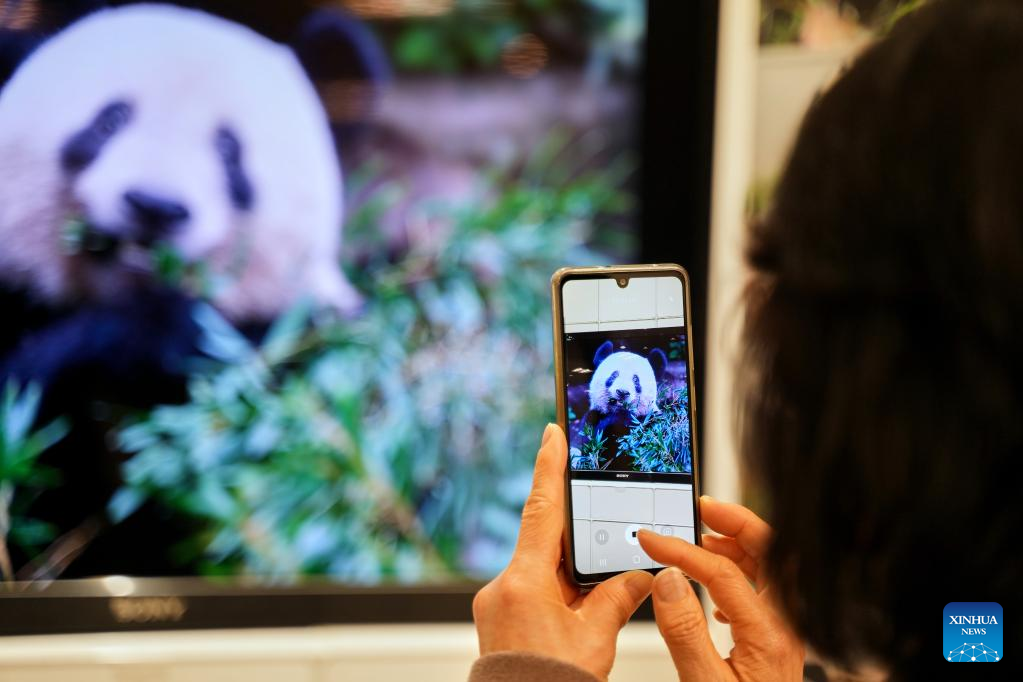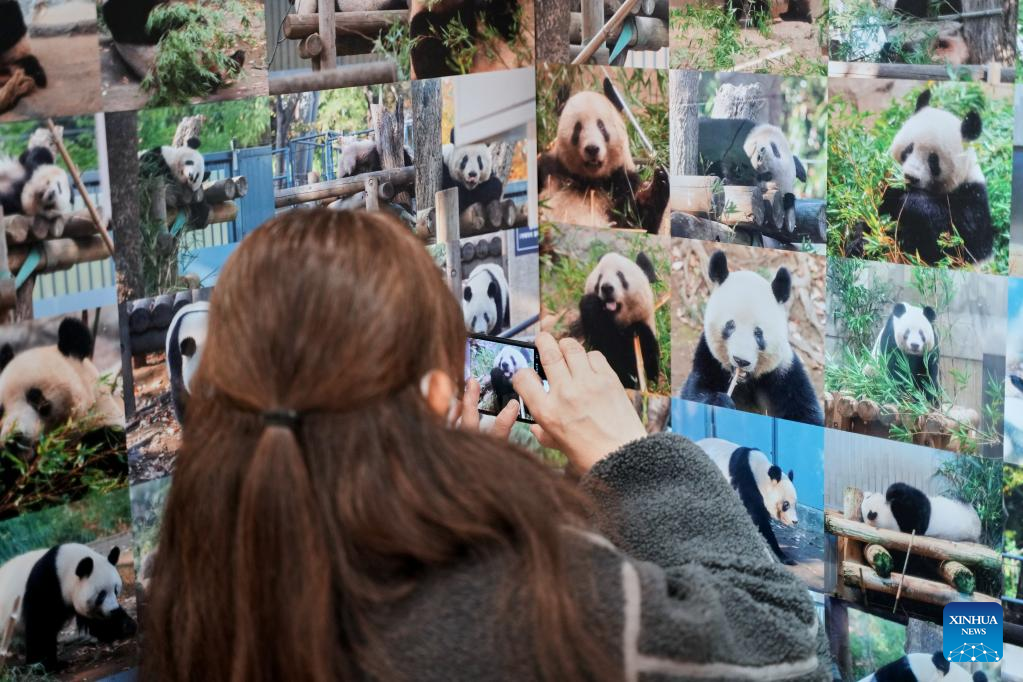 A visitor takes photos of a picture during a photographic exhibition of giant panda Xiang Xiang in Tokyo, Japan, Feb. 17, 2023. Xiang Xiang will be sent home to China on Tuesday. (Xinhua/Zhang Xiaoyu)