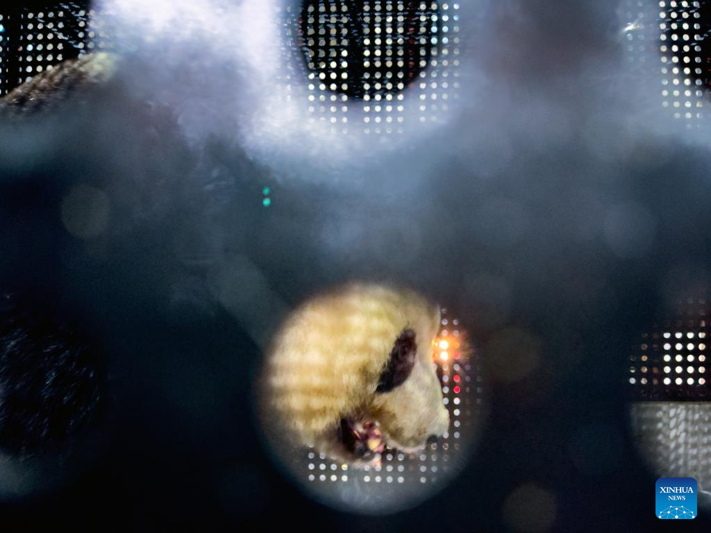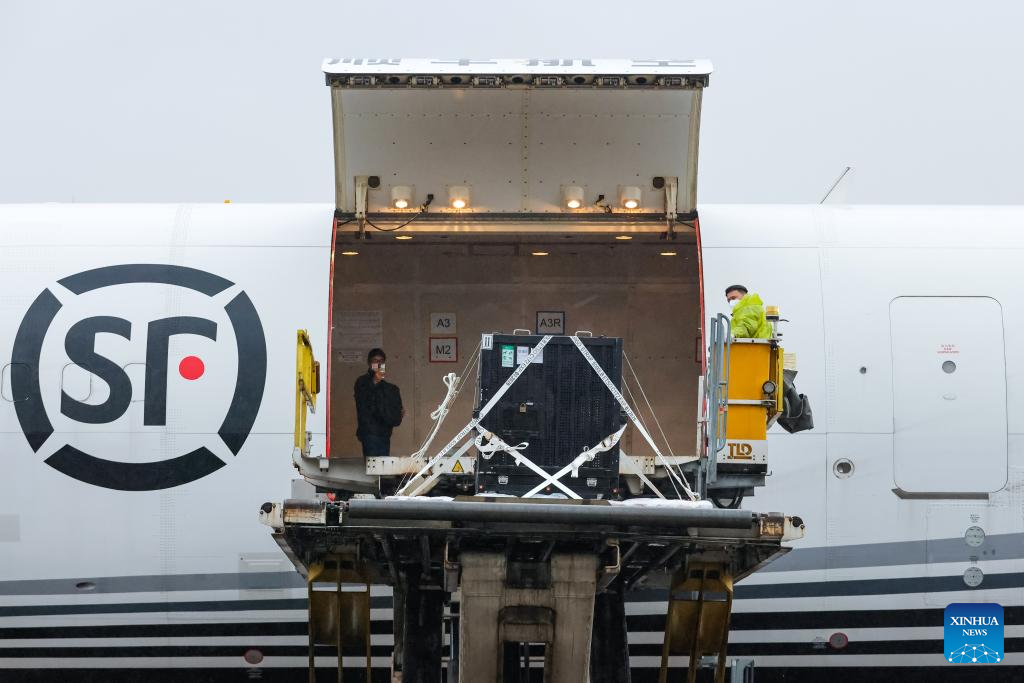 The Japan-born giant panda Xiang Xiang arrives at Chengdu Shuangliu International Airport in southwest China's Sichuan Province, Feb. 21, 2022. (Xinhua/Shen Bohan)