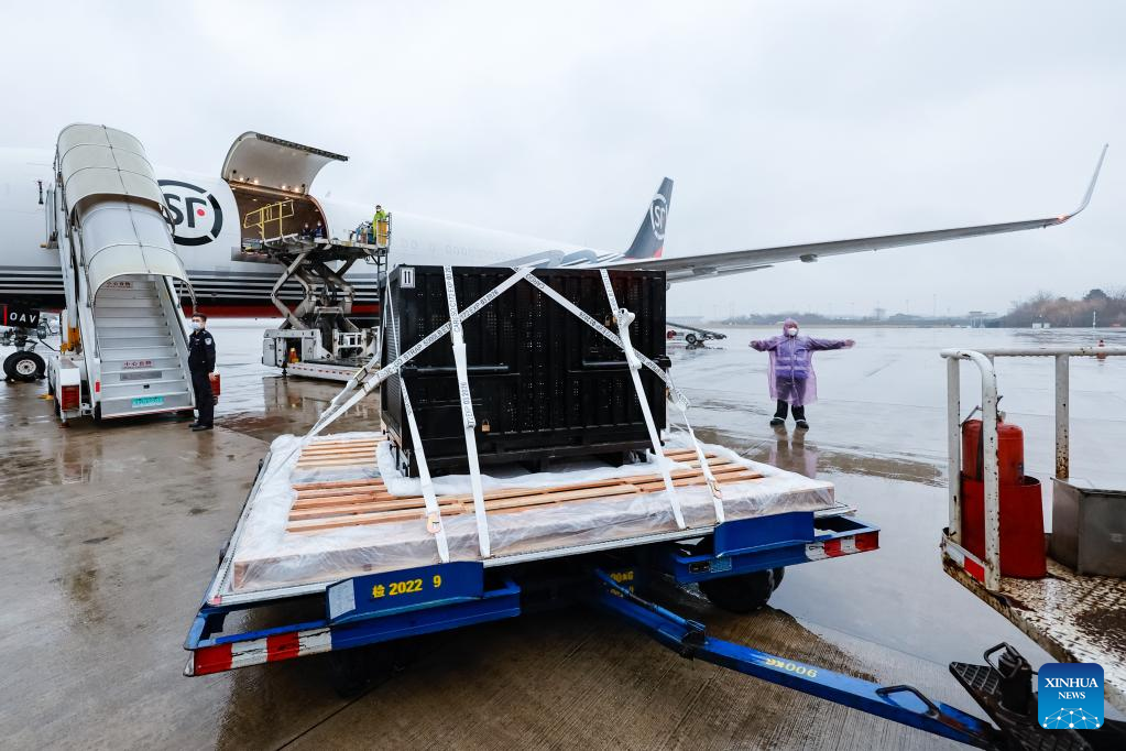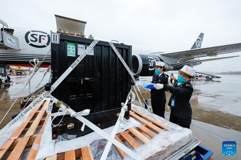 The Japan-born giant panda Xiang Xiang arrives at Chengdu Shuangliu International Airport in southwest China's Sichuan Province, Feb. 21, 2022. (Xinhua/Shen Bohan)