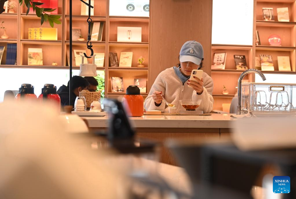People enjoy their leisure time at a tea house in Suning Plaza in Fuzhou, southeast China's Fujian Province, Feb. 26, 2023. The time-honored tea culture has contributed to the thriving of tea houses in Fuzhou. (Xinhua/Lin Shanchuan)