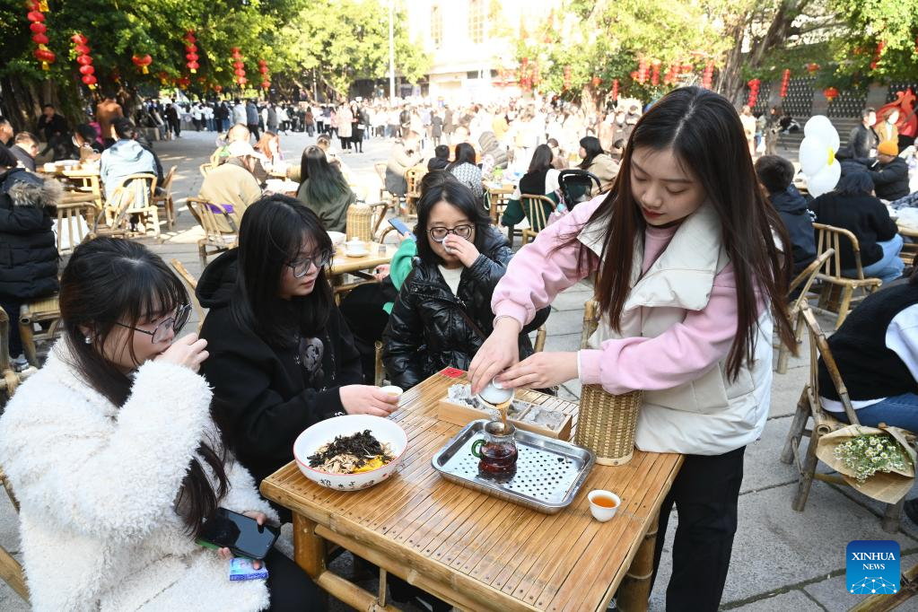 People drink tea in the Shangxiahang traditional block in Fuzhou, southeast China's Fujian Province, Feb. 26, 2023. The time-honored tea culture has contributed to the thriving of tea houses in Fuzhou. (Xinhua/Lin Shanchuan)