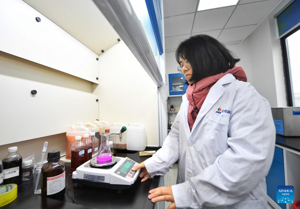 A technician works at a laboratory of an environmental protection tech company in southwest China's Sichuan Province, Feb. 21, 2023. About 400 tons of waste oil is made each day by local catering service industry in Chengdu, among which 70 to 80 percent would be transported to environmental protection tech companies in Sichuan and recycled into products. (Xinhua/Liu Kun)