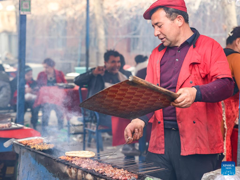 A vendor prepares barbecue at a weekly bazaar in Tokkuzak Township of Shufu County, northwest China's Xinjiang Uygur Autonomous Region, Feb. 26, 2023. (Xinhua/Ma Kai)