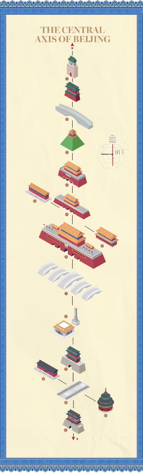 Taken as the backbone of the city, the axis follows the principles for building ancient capital cities, which were recorded in Zhouli Kaogongji (Rites of Zhou: Records of Construction), one of China's oldest technological books.