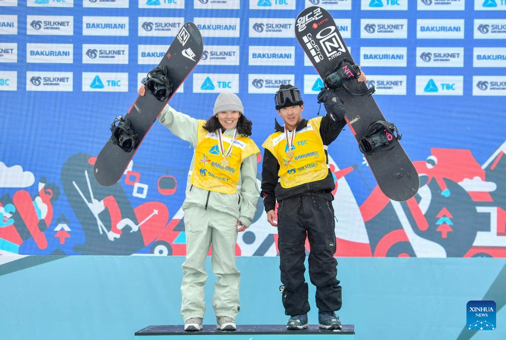 Women's halfpipe gold medalist Cai Xuetong (L) of China and men's halfpipe gold medalist Lee Chaeun of South Korea pose for photos at the FIS Snowboard World Championships in Bakuriani, Georgia, March 3, 2023. (Photo by Tamuna Kulumbegashvili/Xinhua)